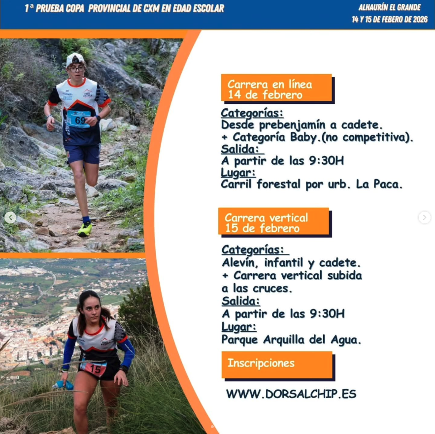 ✅ Por otro lado, el domingo 15 de febrero serán las carreras verticales, con salida desde el parque Arquilla del Agua: una perteneciente a la Copa provincial en edad escolar para las categorías alevín, infantil y cadetes, además de la carrera vertical Subida a las cruces para los nacidos en 2009 y mayores, que saldrán justo antes de las carreras de la copa.