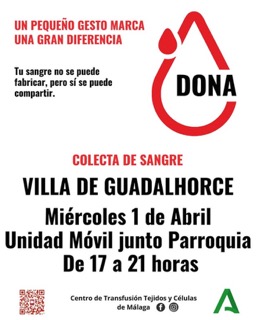 💉🧑‍⚕️Informamos que el Centro de Transfusión, Tejidos y Células de Málaga estará el próximo miércoles, 1 de abril, en Villa del Guadalhorce para que los vecinos y vecinas puedan realizar su donación de sangre.